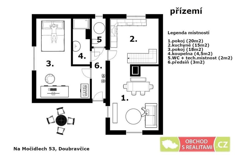 Rodinný dům se nachází na adrese Na Močidlech 53, Doubravčice. Obec leží v okrese Kolín, asi 8 km od města Český Brod nebo 13 km od města Říčany.