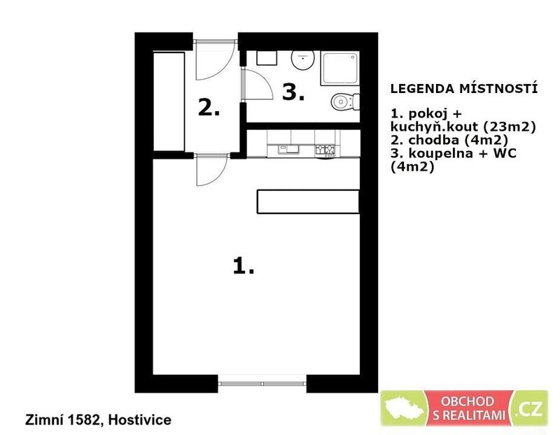 Bytová jednotka o velikosti 31 m2 se nachází v 1. patře dvoupatrového bytového domu v klidné části Hostivice, na adrese Zimní 1582, Hostivice.