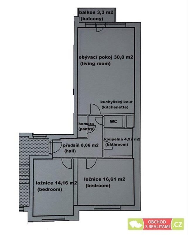 floor area is 77.26 m2 + a 3.3 m2 balcony + a 15.52 m2 cellar.