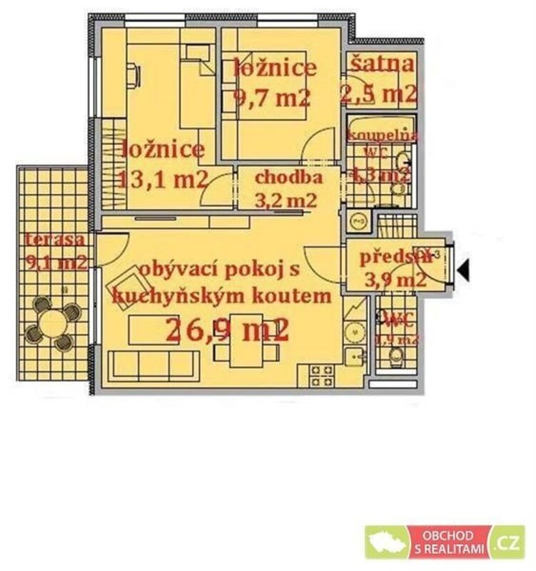 A terrace is accessible directly from the living room, and the apartment layout