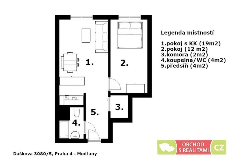s kuchyňským koutem, koupelnu s WC a komoru v bytě, dispoziční plánek