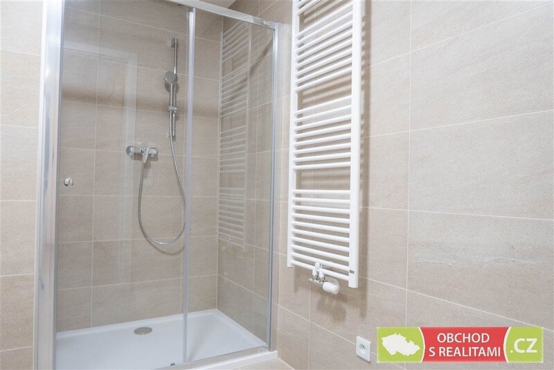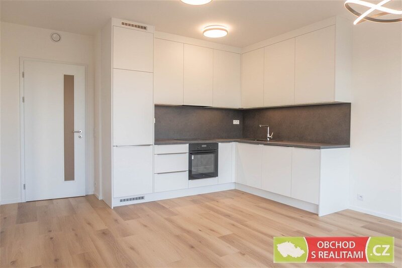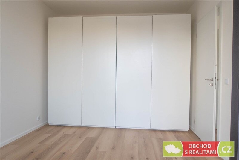 Obývací pokoj je vybaven moderní kuchyňskou linkou se všemi spotřebiči zn. AEG (myčka nádobí, indukční varná deska, pečící trouba, kombinovaná chladnička, digestoř) a bílou komodou. V ložnici se nachází velká šatní skříň. Byt bude dovybaven pračkou se sušičkou umístěnou v komoře bytu. V koupelně se nachází velkorysý sprchový kout. Podlahovou krytinou v pokojích je vinyl.