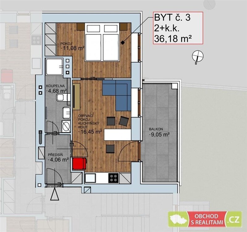 Bytová jednotka o výměře 37,6 m2 s balkónem o rozloze 9 m2 se