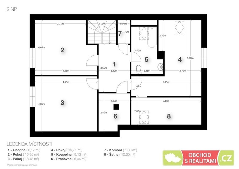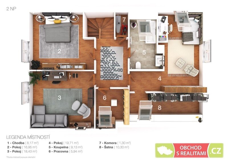 samostatné velké ložnice (17 m2, 18 m2, 20 m2), koupelna, šatna, pracovna