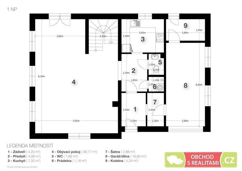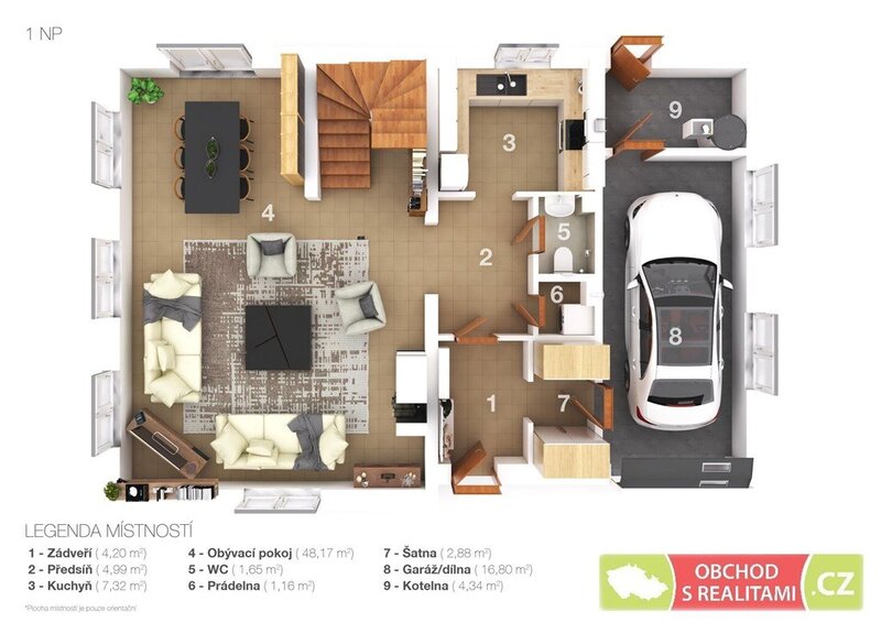 prostorný obývací pokoj (48 m2), samostatná kuchyň, technická místnost